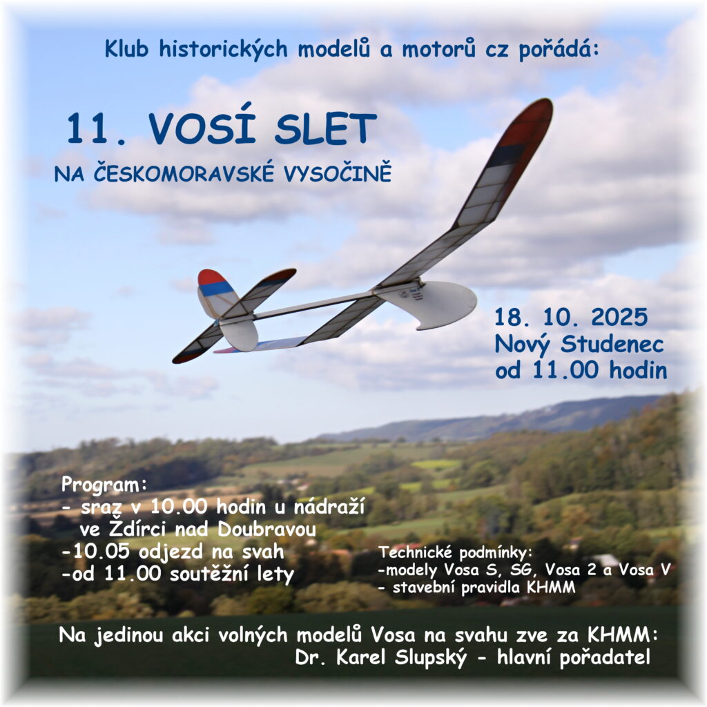 Sezóna hlavních letních sletů a setkávání členů KHMM na veřejných letových akcích pro rok 2025 nenávratně skončila sletem v Žichlicích. Dny se krátí, pro některé z nás začíná stavební sezóna. Pro většinu „vosařů“ však začíná období podzimní a zimní letové aktivity. Tradičně začínáme velkým vosím sletem na svazích Vysočiny. V současné době to je vlastně poslední akce skutečně volných Vos létajících na svahu tak, jak Vosy ve svých počátcích hlavně létaly. Tedy prostým hozením z kopce dolů. Po ztrátě možnosti létat stejným způsobem v Plzni, je slet na Vysočině jediným, kdy můžeme létat volně, bez korekce RC řízením. Tuším, že je tato soutěž i jedinou soutěží neřízených volných modelů na svahu i v rámci ČR. Volně na svahu se létá ještě kategorie F1E, ale magnet je samozřejmě prvek řídící rovný let, Vše podstatné je v následující pozvánce: