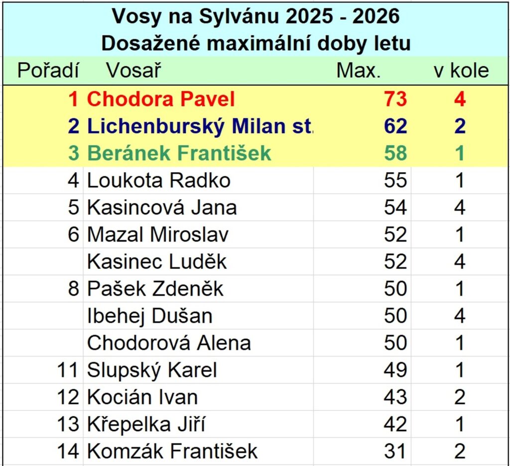 Nikdo dnes neočekával zázračné výkony modelů. Přesto byly délky letů naprosto nadstandardní, S úžasem jsme sledovali pátý let Pavla Chodory: po odhození model vystřelil do výšky a po citlivém řízení s využitím okamžiku nafukovaného svahu, byl na stopkách časoměřiče, nejdelší letošní výkon této soutěže. Čas 73 sekundy je nejdelším letem letošního ročníku a Pavel si tak odnesl cenu a titul „Rekordman Sylvánu 2026“.